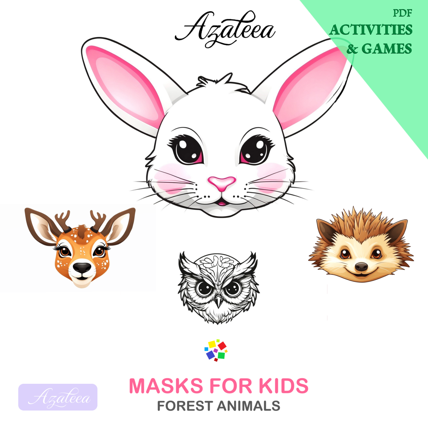 - 7 forest animal masks: fox, owl, deer, bunny, hedgehog, bear, and wolf